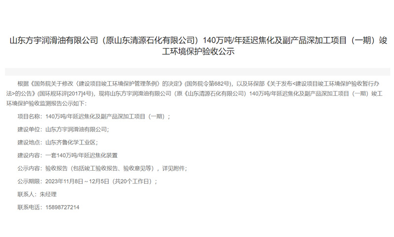 根據《國務院關于修改〈建設項目竣工環(huán)境保護管理條例〉的決定》(國務院令第682號),以及環(huán)保部《關于發(fā)布<建設項目竣工環(huán)境保護驗收暫行辦法>的公告》(國環(huán)規(guī)環(huán)評[2017]4號),現將山東方宇潤滑油